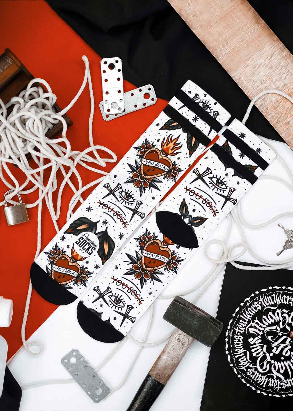 Die Herausforderung wurde Realität, als wir auf die Straße gingen, um Musik- und Sportfestivals in ganz Europa zu besuchen und dabei eine Gemeinschaft von #Sockers aufzubauen, während wir gleichzeitig neue Generationen von Originalprodukten inspiriert von Rockmusik, Tattoo-Kultur und Extremsportarten verbesserten und entwickelten. Wir sind das mutige eigenwillige Unternehmen, das es wagt, sich durch Design zu unterscheiden.